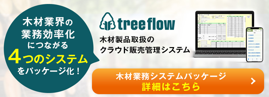 これらの課題を解決する為、フルタニランバーとシステム会社のアイパブリッシングは、新たな業務パッケージシステム「treeflow」を全国に展開しています。また、treeflowは同業界に留まるだけでなく、総合的な在庫管理システムとしても効果が見込めます。是非ご検討ください。
